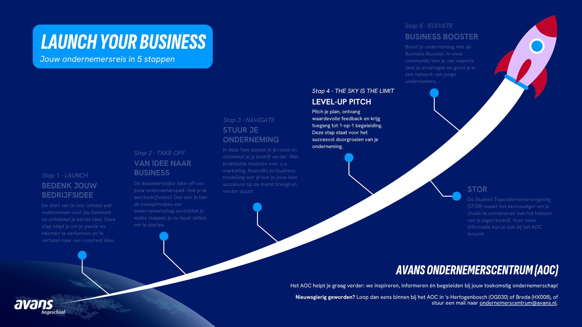 At the Avans Ondernemerscentrum (AOC), you as a student get the chance to really work on your business. If you’ve already taken steps with your company, you can do a Level-up Pitch with our business developers. This is your moment to show where you stand as an entrepreneur!
