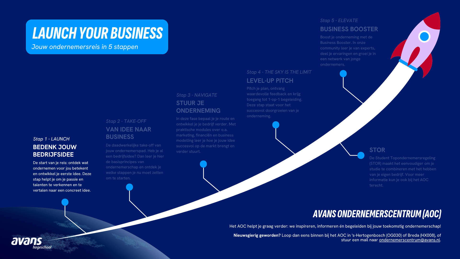 Het Avans Ondernemerscentrum (AOC) is er speciaal voor studenten van Avans die willen ondernemen of al een eigen bedrijf zijn gestart. Het AOC ondersteunt je bij elke stap van je ondernemersreis.