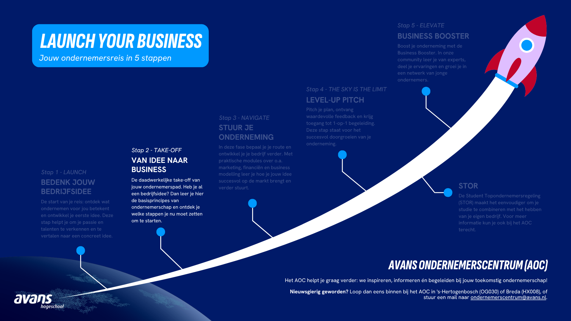 Het Avans Ondernemerscentrum (AOC) is er speciaal voor studenten van Avans die willen ondernemen of al een eigen bedrijf zijn gestart. Het AOC ondersteunt je bij elke stap van je ondernemersreis.